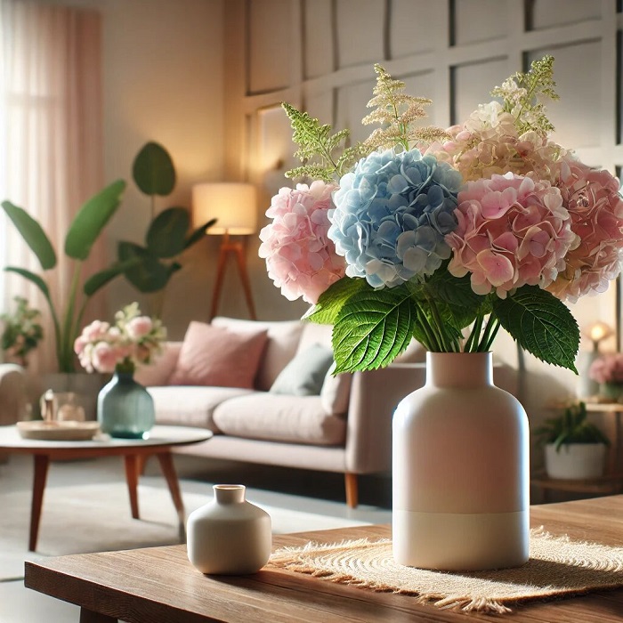 Гортензии ценятся за их декоративные качества и универсальность. Они подходят для разных стилей интерьера: от классики до современного минимализма. Пышные соцветия создают ощущение уюта и гармонии, а широкий спектр оттенков — от белого и кремового до насыщенного синего и розового — позволяет подобрать цветы под любой интерьер.